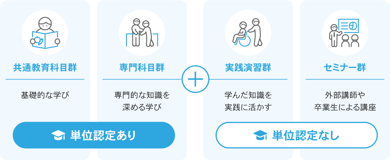 ミライドプログラムは4つの学びのグループに分かれています。基礎をしっかり学べる「共通教育科目群」、専門的な知識を深める「専門科目群」、実際に体験して学ぶ「実践演習群」、そして現場で活躍している人や先輩学生から直接学べる「セミナー群」があります。これらの学びを通して、知識と実践力の両方をバランスよく身につけることができ、皆さんの成長をサポートします。