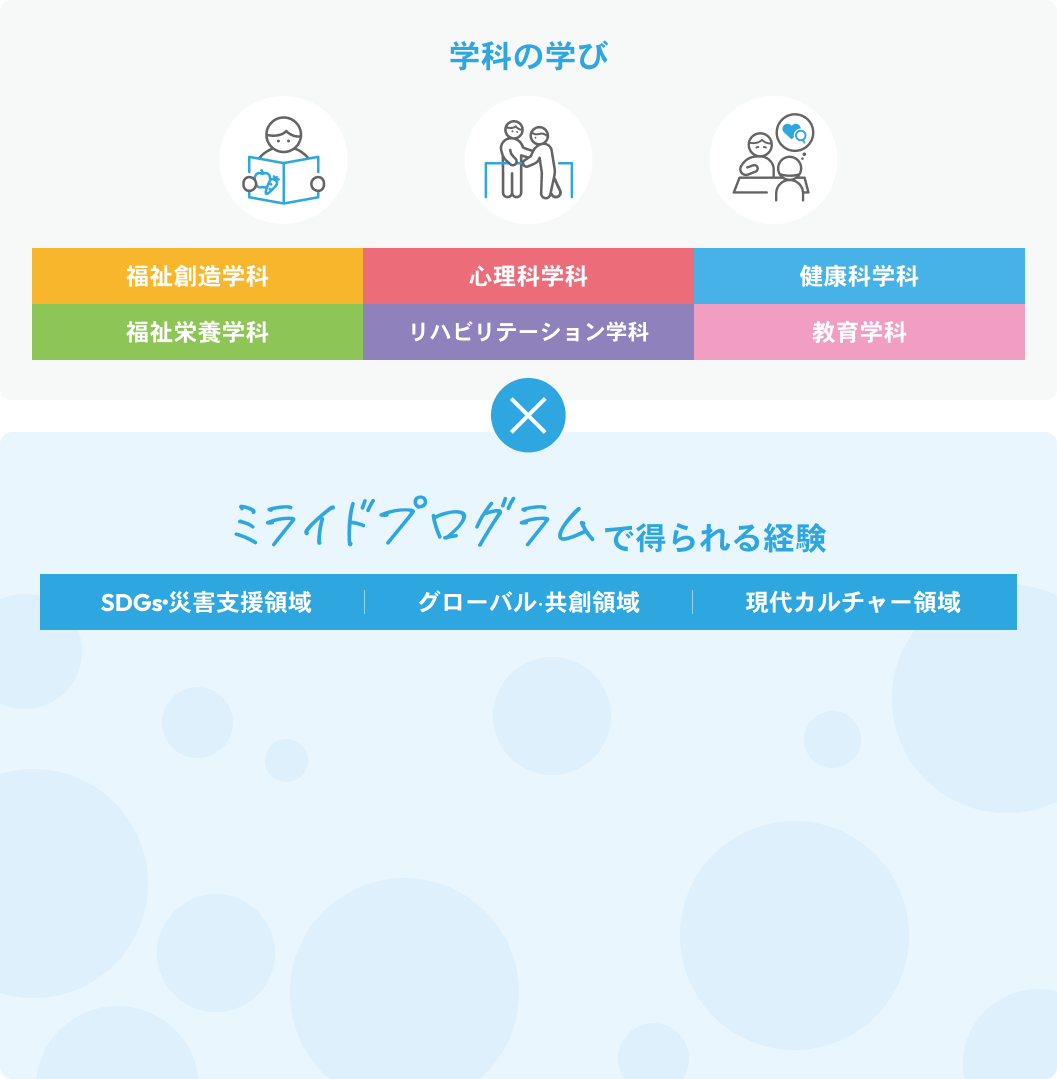 学科の専門的な学びにミライドプログラムの特色ある3つの領域を組み合わせることで、